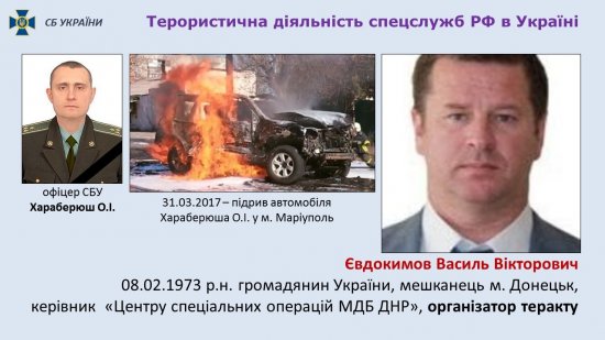 «Саме Євдокімов-«Ленін» за завданням російських спецслужб організував підрив 31 березня 2017 року автомобіля контррозвідника СБУ полковника Олександра Хараберюша у Маріуполі», ‒ нагадав Василь Грицак. У 2017 році Шутов за завданням спецслужб Росії безпосередньо здійснював підготовку нового терористичного акту, виконавцями якого мали стати Комарічєв і Дзортов. Весь час Шутов залишався у Донецьку, своїми агентами керував за допомогою шифрованого листування. Оперативники Служби безпеки України встановили всіх членів цієї агентурної мережі. У результаті вжитих СБУ заходів російські спецслужби у 2017 році відмінили операцію, але не відмовилися від організації терористичного акту.