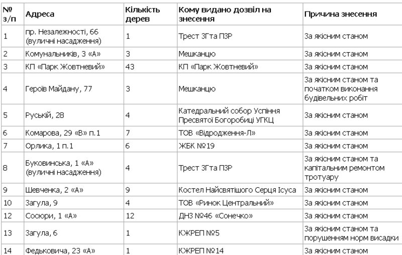 Адреси, за якими надані дозволи на знесення дерев протягом січня 2020 року.
