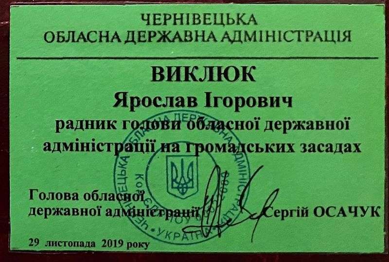 “А давайте зробимо Буковину кращою. Просто – найкращою!”, – підписав виставлені у соцмережі фото посвідчення Я. Виклюк.