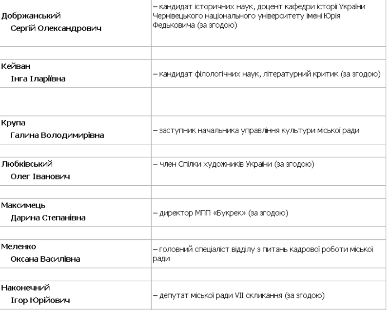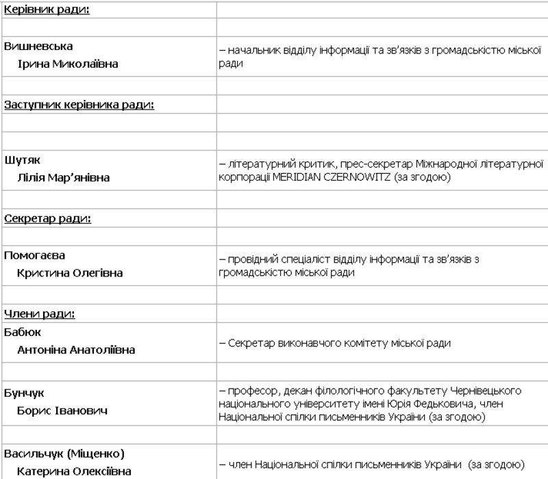 До складу Експертної ради ввійшли авторитетні письменники, науковці, культурні та громадські діячі, літературознавці, мистецтвознавці, журналісти, працівники окремих виконавчих органів міської ради.