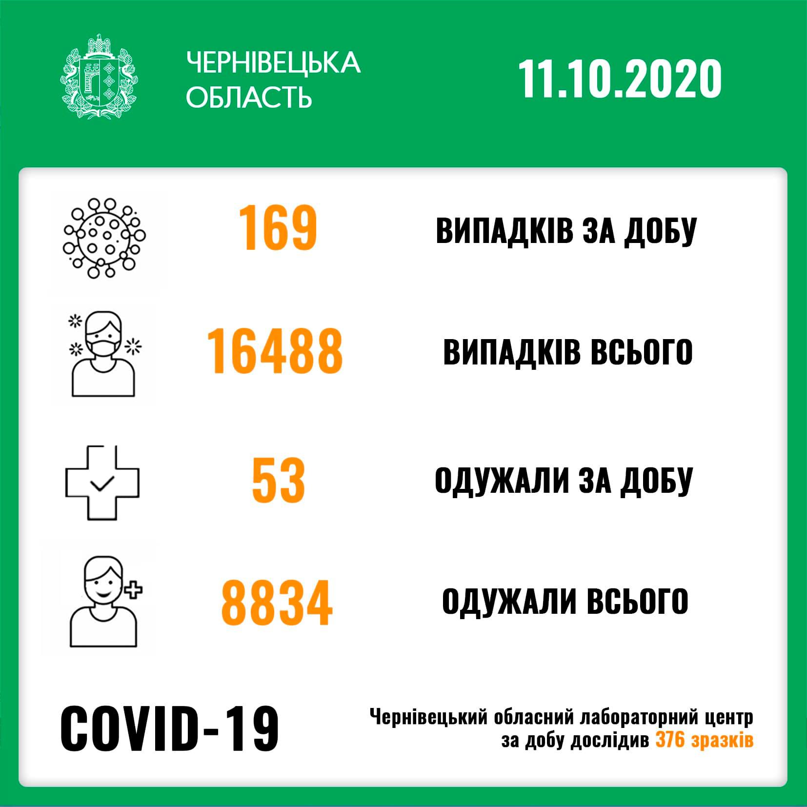 Станом на 12 жовтня у Чернівецькій області виявили 169 нових випадків COVID-19. Від моменту звістки про першого хворого інфікувалися вже 16 488 буковинців. Із них 8 834 людини вже одужали, а 53 — за останню добу.