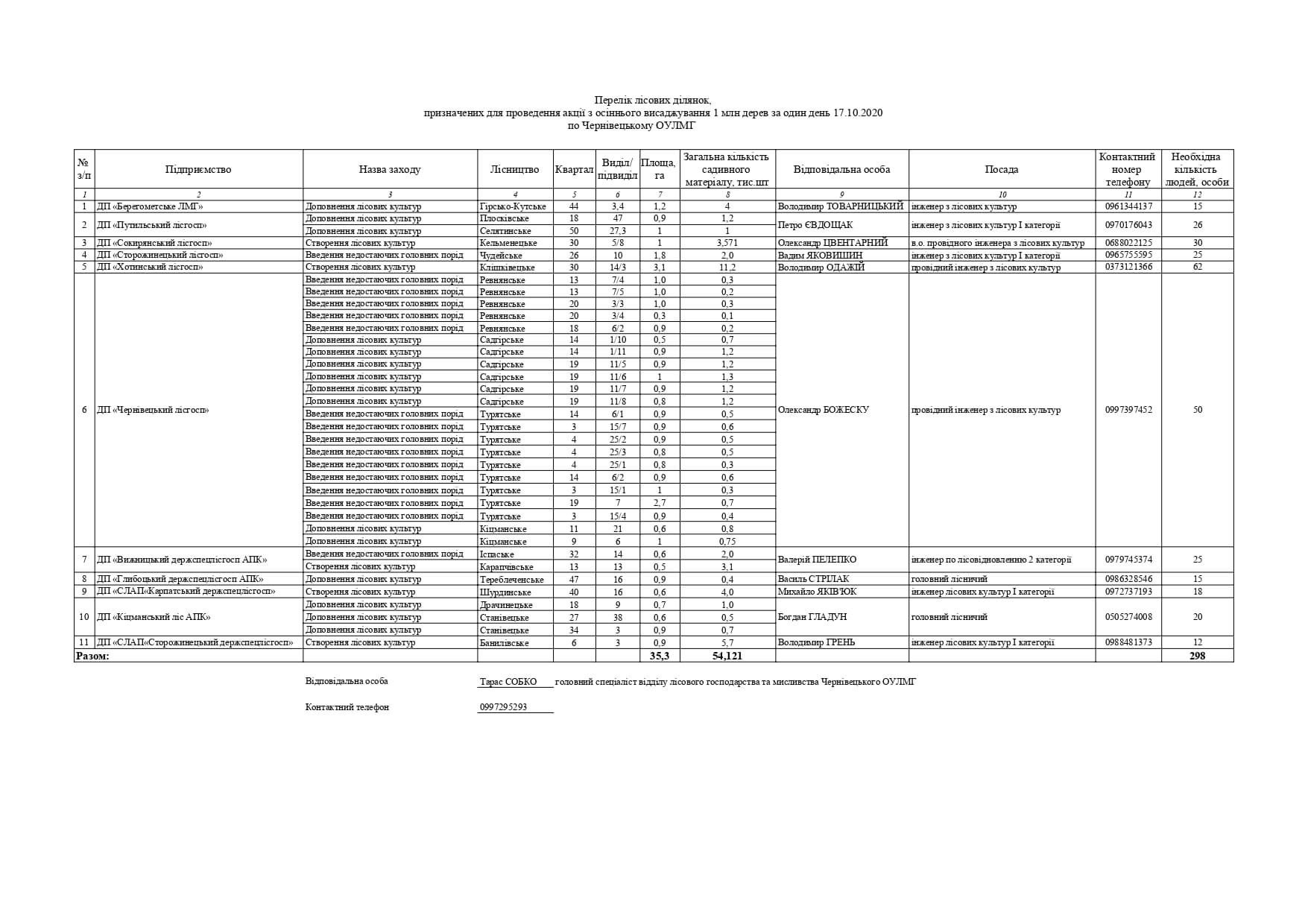 Перелік лісових ділянок, призначених для проведення акції з осіннього висаджування по Чернівецькому лісгоспу, та контакти відповідальних осіб (можна подивитися також за посиланням):