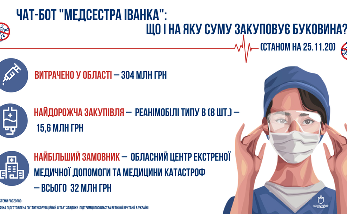 Відтепер перевірити які медичні засоби закупило будь-яке місто чи село Буковини можна через чат-бот “Медсестра Іванка”. Його запустила громадська організація “Антикорупційний штаб”. Мета чат-боту – допомагати українцям виявляти корупцію в медичних закладах.