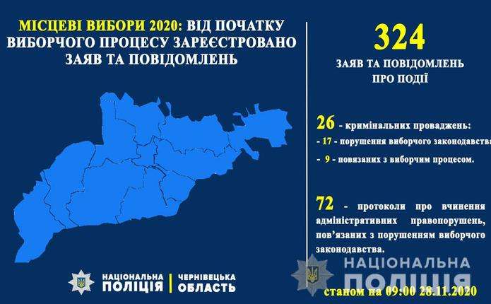 У період з 5 вересня по 28 листопада 2020 року до підрозділів поліції Чернівецької області загалом надійшло 324 заяви та повідомлення про порушення виборчого законодавства. Усього органами поліції Чернівецької області складено 72 протоколи про вчинення адміністративних правопорушень, пов’язаних з порушенням виборчого законодавства.