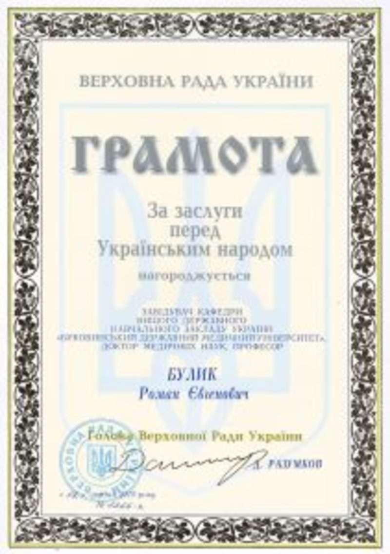 Розпорядженням Голови Верховної Ради України № 1266-к від 12 грудня 2019 року за вагомий особистий внесок у розвиток вітчизняної освіти, плідну навчально-педагогічну діяльність сумлінну працю та високий професіоналізм нагороджені Грамотами Верховної ради України співробітники Буковинського державного медичного університету: