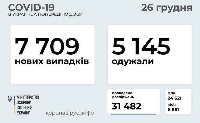 7 709 нових випадків коронавірусної хвороби COVID-19 зафіксовано в Україні станом на 26 грудня 2020 року. Зокрема, захворіли 366 дітей та 198 медпрацівників. Про це повідомляє телеграм-канал Коронавірус Інфо.