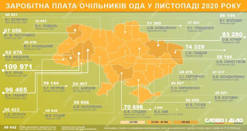 Щодо голови Чернівецької ОДА Сергія Осачука, то у листопаді він отримав понад 56 тисяч гривень заробітньої плати (56423 грн). Це середній показник серед очільників областей.
