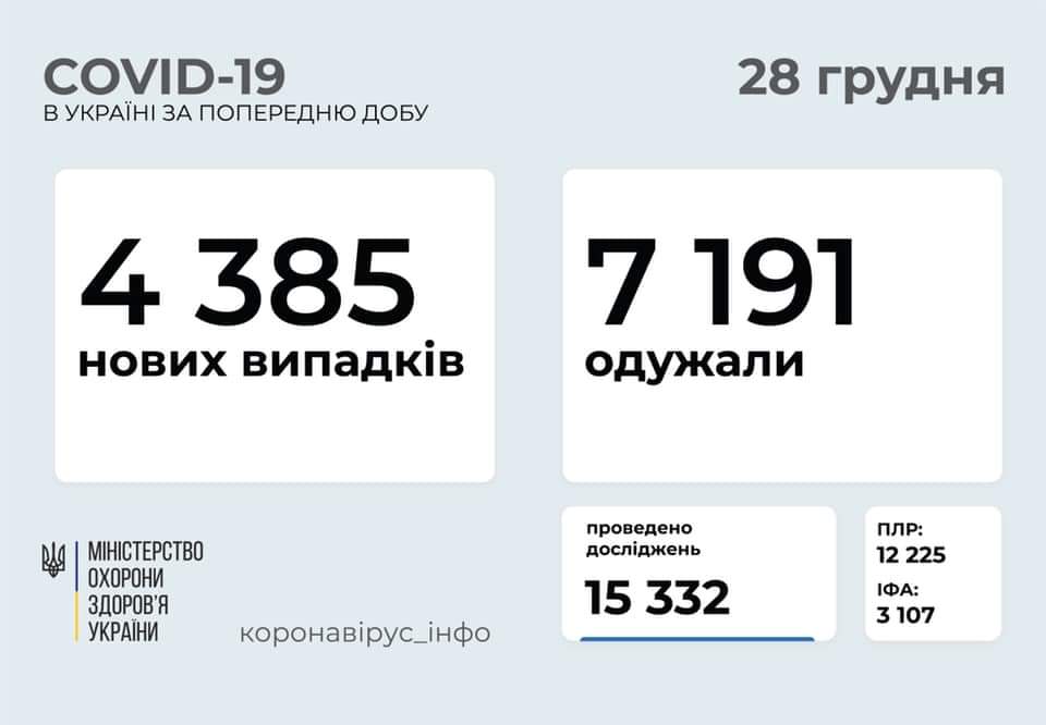 В Україні за минулу добу коронавірус підтвердили у 4 385 людей. Також відомо, що вчора 7 191 пацієнт одужав, а 75 померли від ускладнень.