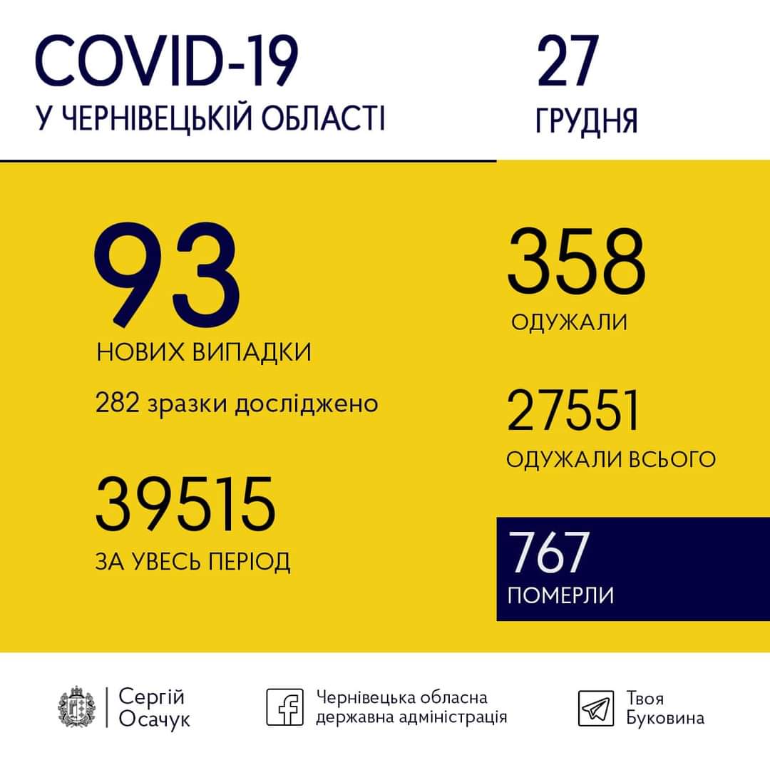 Станом на 28 грудня на Буковині виявили 93 нові випадки коронавірусу. Одужали ж за добу 358 людей.