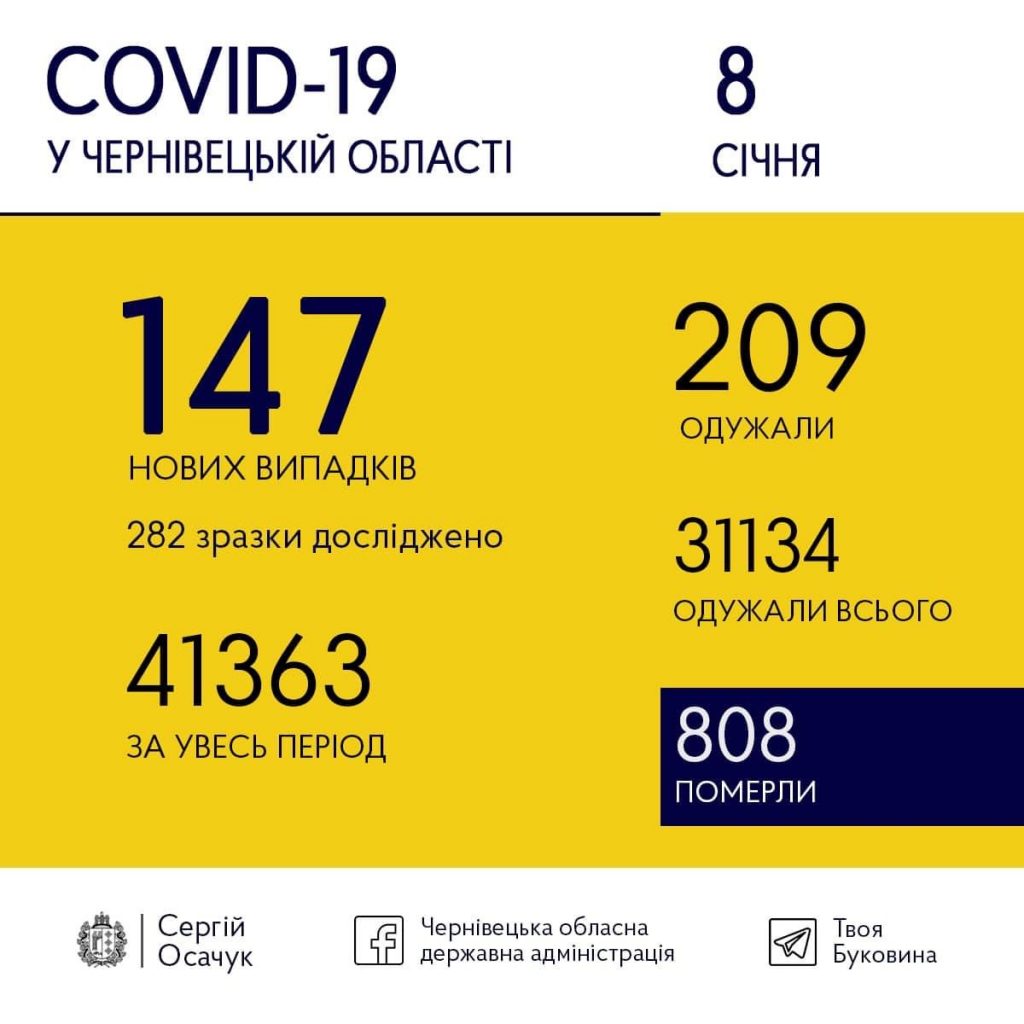 147 нових випадків COVID-19 виявили учора, 8 січня, у Чернівецькій області. Водночас 209 буковинців одужали.