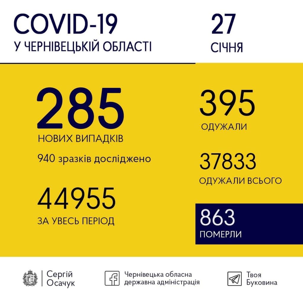 289 нових випадків COVID-19 виявили у Чернівецькій області 27 січня. До того ж, учора одужали 395 буковинців.