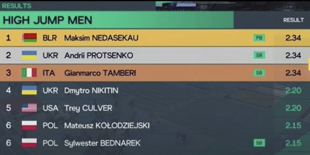 Андрій Проценко та італієць Джанмарко Тамбері здолали 2,34 м з третьої спроби. Українець опинився на 2 місці, бо взяв попередню висоту — 2,31 м — із першого разу.