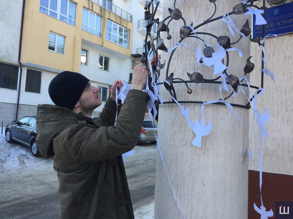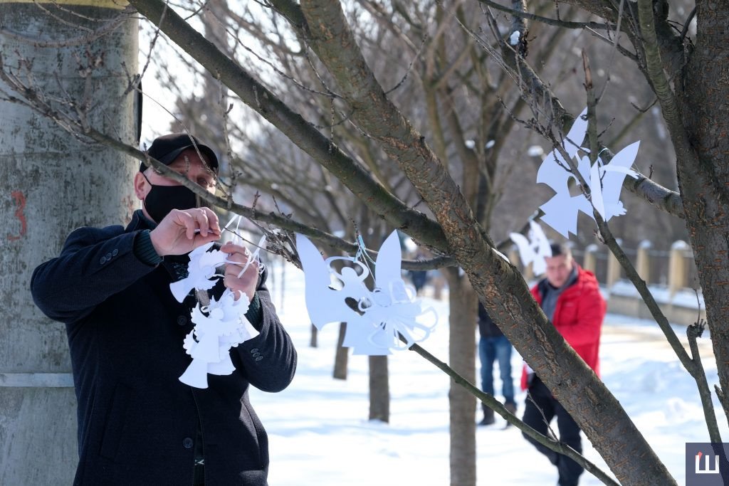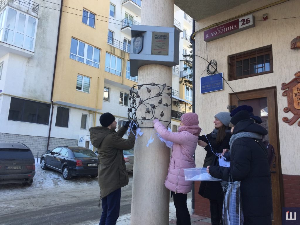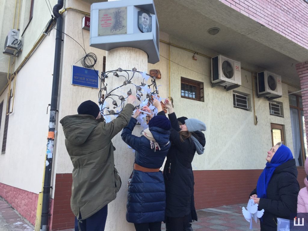 Люди зібралися на декількох локаціях міста та залишили на деревах паперових ангелів – символ охоронців, які вберегли Україну від лиха. Однією з локацій була будівля на вул. В. Аксенина, на якій встановили меморіальну дошку загиблому Герою.