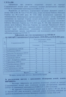 Сторожинецька міська рада провела засідання комісії з питань ТЕБ та НС. Відповідно до постанови КМУ №1236 з усіма змінами та доповненнями було заборонено роботу усіх суб’єктів господарювання згідно виду діяльності відповідно до цієї постанови та додатково прийнято рішення не відновлювати навчання у навчальних закладах, крім дитячих садків, у зв’язку із збільшенням захворюваності на COVID-19.