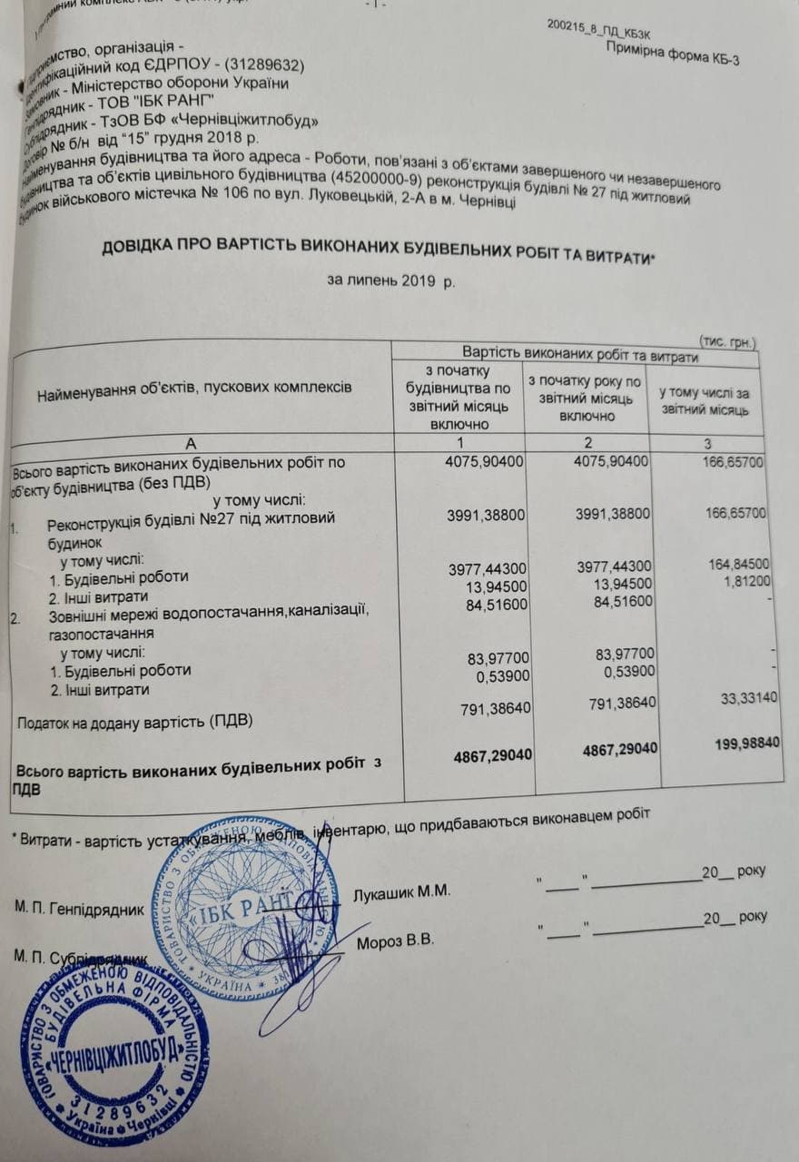 Якщо простіше, суть складних юридичних формулювань із вуст правоохоронців полягає в тому, що підприємство Володимира Мороза «Чернівціжитлобуд» проводить реконструкцію колишнього військового об’єкта на вулиці Луковецькій, 2-А. Роботи виконують на замовлення Подільського управління капітального будівництва Міністерства оборони України.