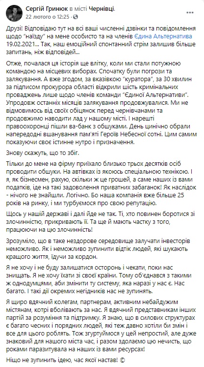 «Спочатку були погрози та залякування. А вже згодом за вказівкою «куратора» впродовж 30 хвилин за підписом прокурора области відкрили шість кримінальних проваджень щодо членів команди «Єдина альтернатива». Впродовж останніх місяців залякування продовжувалися. І нарешті правоохоронці пішли ва-банк з обшуками», — написав у на своїй фейсбук-сторінці Сергій Гринюк.