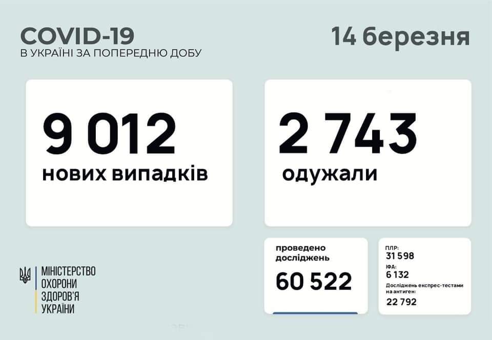В Україні за минулу добу коронавірус виявили у 9 012 людей. Також 2 743 пацієнти одужали, а 145 — померли від ускладнень.
