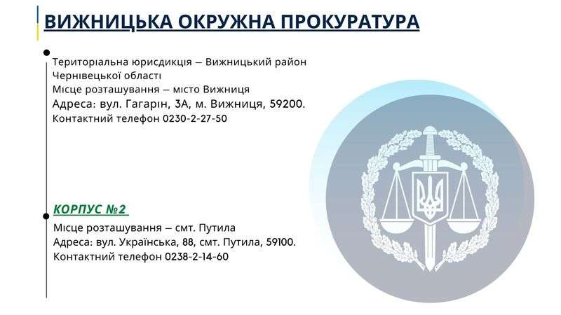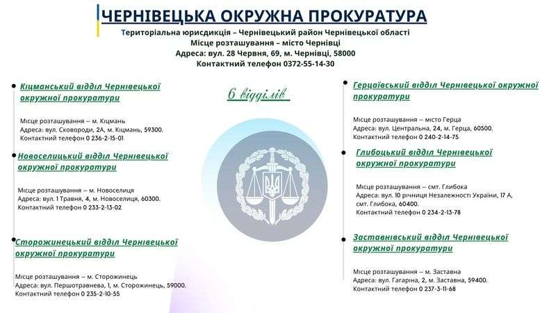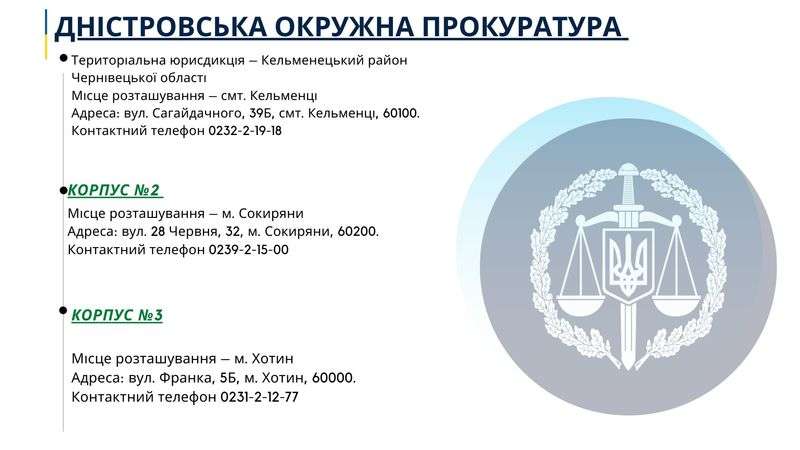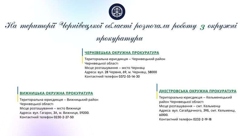 Крім того, наказом Генерального прокурора від 17.02.2021 № 39 затверджено перелік і територіальну юрисдикцію окружних прокуратур. Згідно з додатком до вказаного наказу, на території Чернівецької області створюють три окружні прокуратури: Чернівецьку, Вижницьку та Дністровську, інформує пресслужба обласної прокуратури.