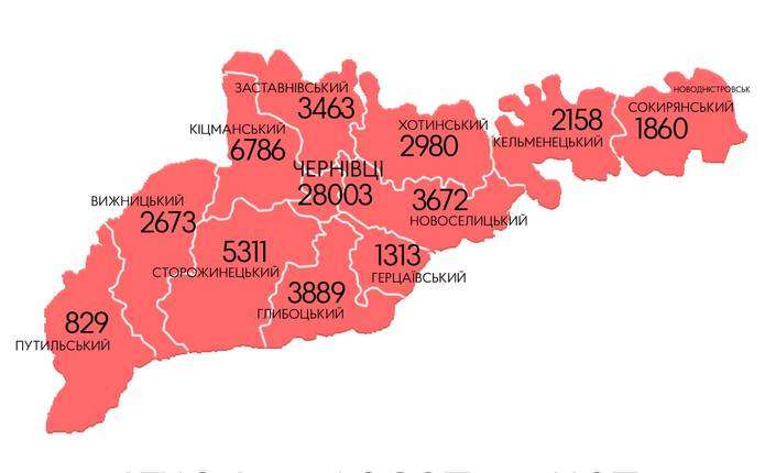 Найбільше інфікованих у Чернівцях (28003), Кіцманському (6786), Сторожинецькому (5311), Глибоцькому (3889), Новоселицькому (3672), Заставнівському (3463), Хотинському (2980) районах. Найменше людей заразилися на Путильщині (829).