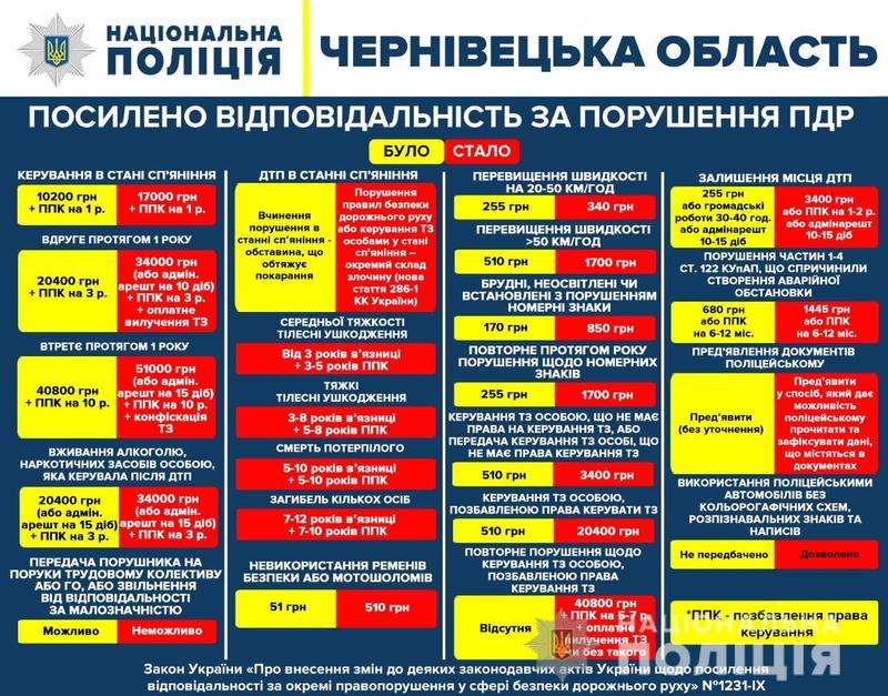 Сьогодні, 17 березня, вступив у дію Закон України «Про внесення змін до деяких законодавчих актів України щодо посилення відповідальності за окремі правопорушення у сфері безпеки дорожнього руху». Він передбачає збільшення відповідальності водіїв і пішоходів за ті порушення, які найчастіше стають причинами травматизму та смертності на автошляхах України. Про це повідомляє відділ комунікації поліції у Чернівецькій області.