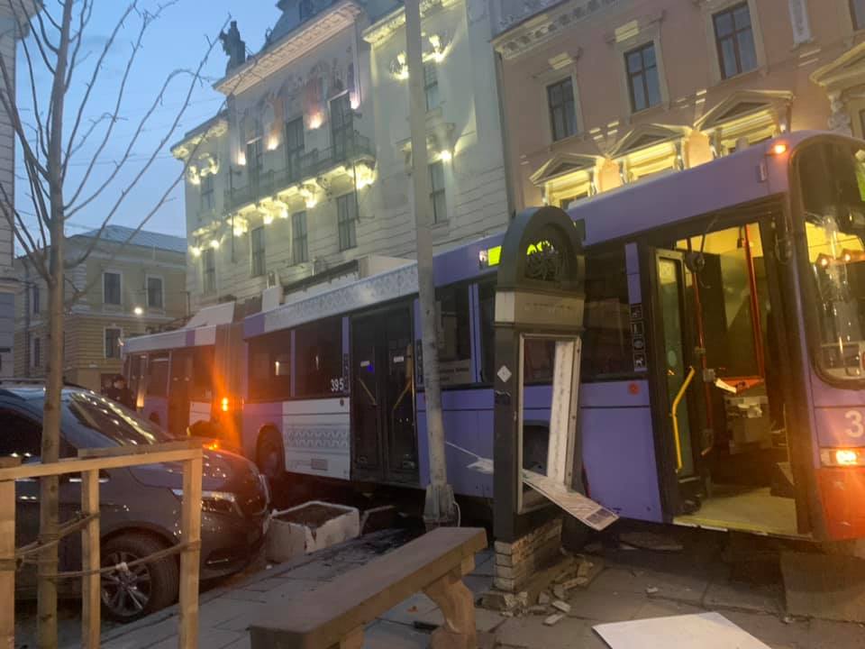 Тролейбус який курсує за маршрутом 6А протаранив Клумби та автомобіль, врізався в стелу та дерево.