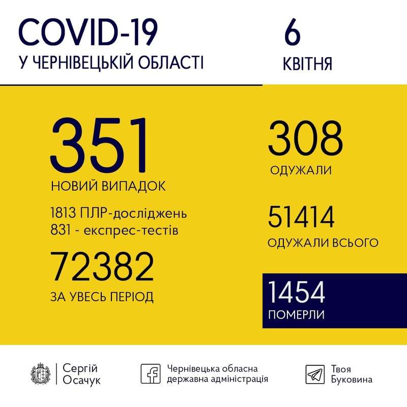 6 квітня на Буковині виявили 351 новий випадок коронавірусу.