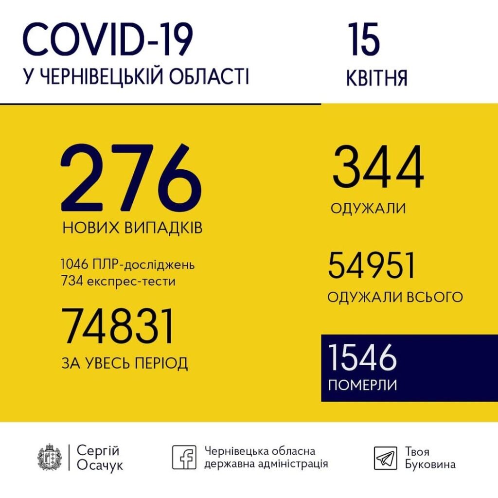 У Чернівецькій області за минулу добу зафіксували 276 нових інфікувань.