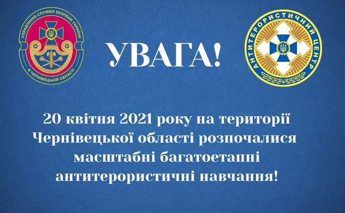 У Чернівецькій області 20 квітня 2021 року СБУ розпочала масштабні багатоетапні антитерористичні навчання. Під час тренувань посилена увага приділятиметься відпрацюванню дій із захисту стратегічно важливих об’єктів та кордонів держави. Про це повідомляє пресслужба СБУ в Чернівецькій області.