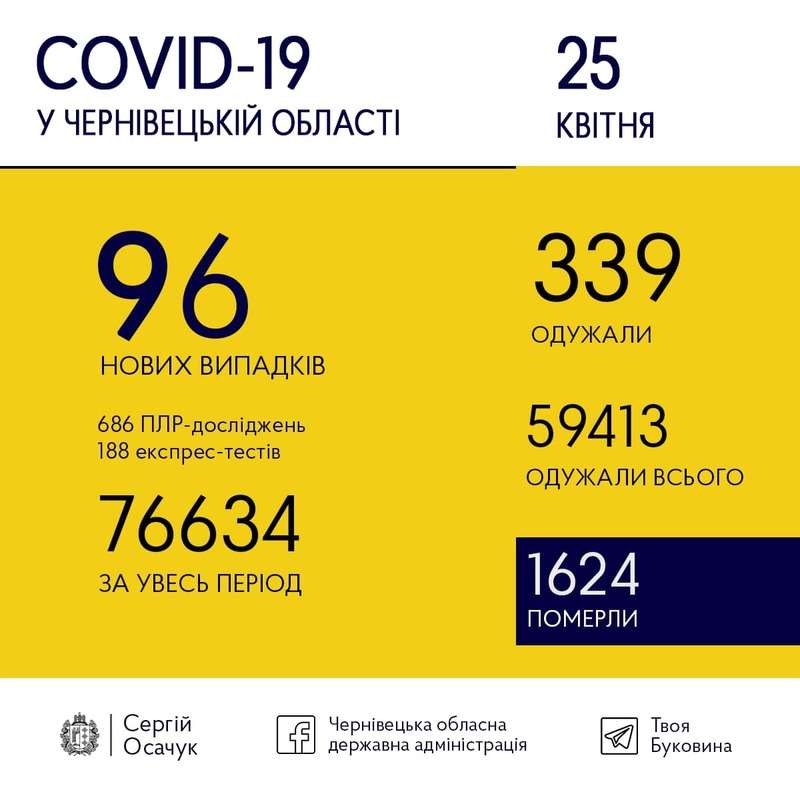25 квітня на Буковині виявили 96 нових випадків коронавірусу.