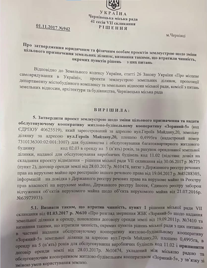 За адресою Героїв Майдану, 20, знаходиться будівля колишнього хлібзаводу на ділянці майже пів гектара. Цей ласий для забудовників шматочок отримала ЖБК «Зоряний-5», тісно пов’язана із Зазуляком. Спочатку фірма взяла в оренду цю земельну ділянку для, нібито, обслуговування виробничих будівель. А коли Зазуляк вже став членом виконкому, змінили цільове призначення під будівництво багатоквартирного будинку.