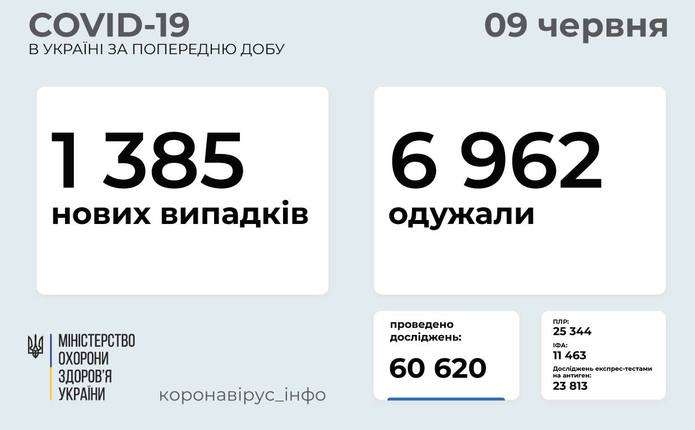 1 385 нових випадків коронавірусної хвороби COVID-19 зафіксовано в Україні станом на 9 червня 2021 року. Зокрема, захворіли 57 дітей та 74 медпрацівники. Про це йдеться у Telegram-каналі “Коронавірус-інфо”.