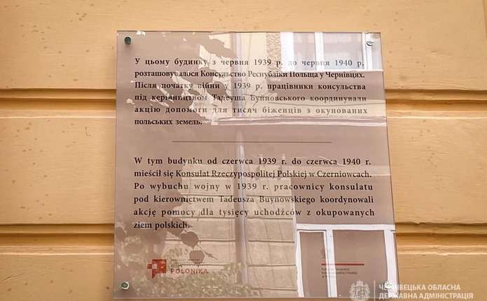 У Чернівцях на будинку, де у 1939 році працювало Консульство Республіки Польща, відкрили пам’ятну дошку. Дипломатична установа діяла у приміщенні, що на вулиці Вірменській, 14, близько року, повідомляє Чернівецька ОДА на сторінці у facebook.