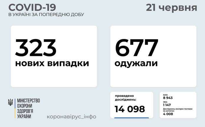 323 нових випадки коронавірусної хвороби COVID-19 зафіксовано в Україні станом на 21 червня 2021 року. Зокрема, захворіли 15 дітей. Про це повідомляє телеграм-канал Коронавірус Інфо.
