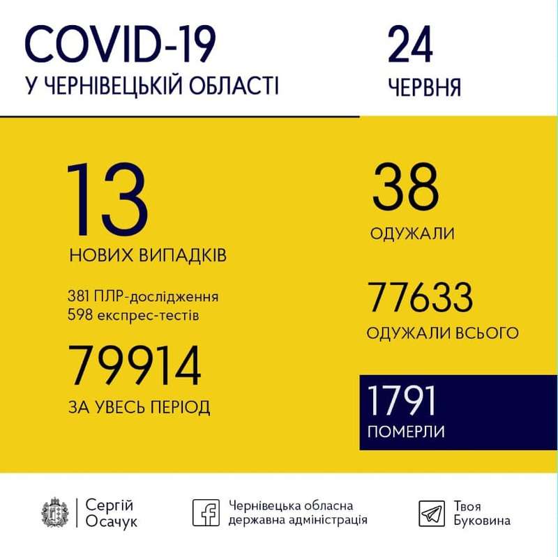 24 червня на Буковині виявили 13 нових випадків коронавірусу.