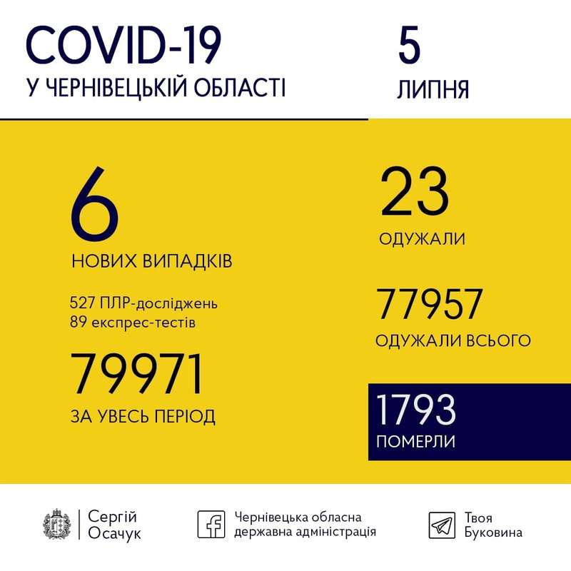 5 липня на Буковині виявили 6 нових випадків коронавірусу.