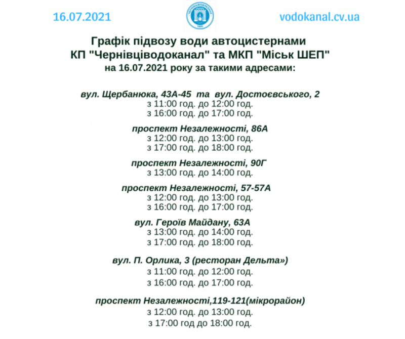 Сьогодні, 16 липня 2021 року, через витік води на проспекті Незалежності, 90 та вулиці Небесної сотні, 6 з 9:00 до 19:00 без водопостачання будуть низка будинків. У зв’язку з аварією чернівчанам підвозитимуть воду. Про це йдеться на сайті КП “Чернівціводоканал”.