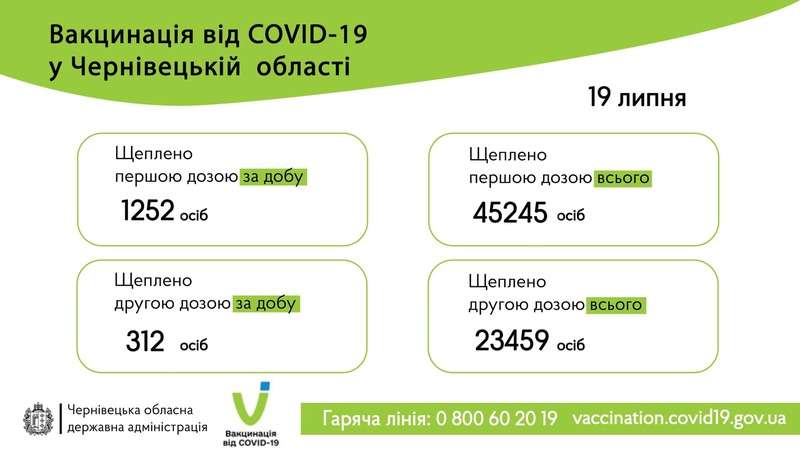 19 липня, у Чернівецькій області від COVID-19 щепили 1564 особи, у тому числі: першою дозою – 1252, другою дозою – 312.