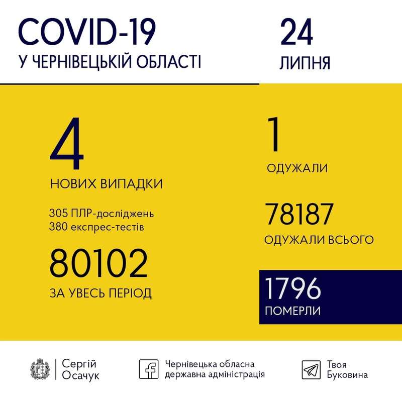 24 липня на Буковині виявили 4 нових випадки коронавірусу.
