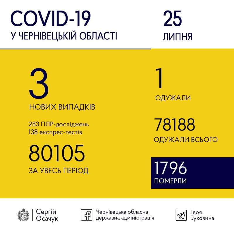 25 липня на Буковині виявили 3 нових випадки коронавірусу.