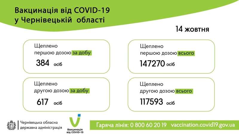 14 жовтня, у Чернівецькій області від COVID-19 щепили 1001 особу, у тому числі: першою дозою – 384, другою дозою – 617.