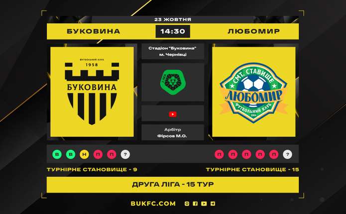23 жовтня о 14:30 у матчі 15 туру Другої ліги «Буковина» у Чернівцях прийматиме «Любомир» із смт. Ставище (Київська область). Матч обслуговуватиме бригада арбітрів, яку очолює 29-річний Максим Фірсов із Рівного. Про це пише bukfc.com.