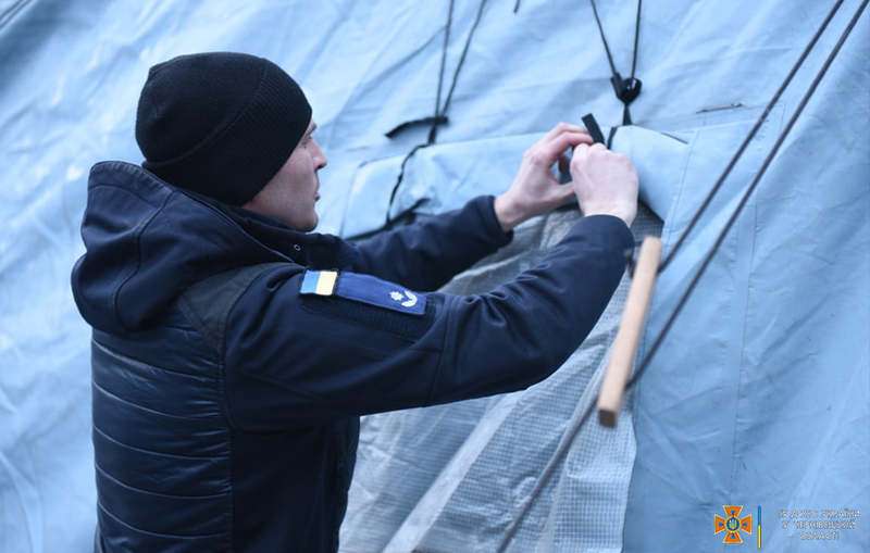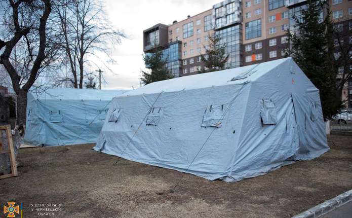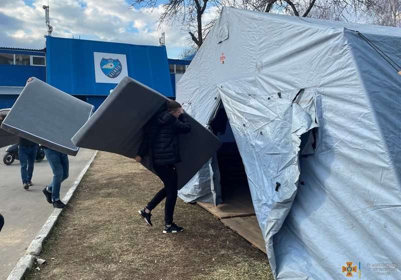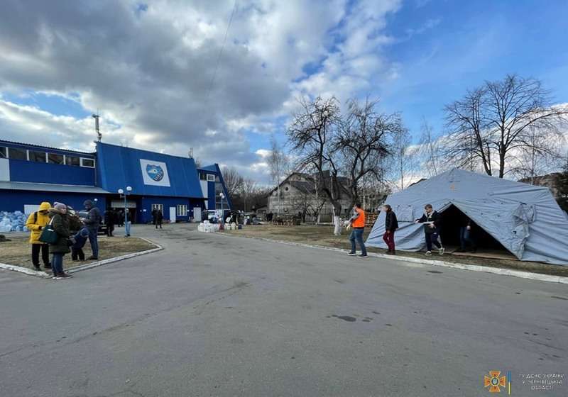 Учора на території ФОК «Олімпія» у місті Чернівці працівники 1 державного пожежно-рятувального загону Головного управління ДСНС України у Чернівецькій області розгорнули три намети. Їх використовуватимуть як місця для зберігання речей першої необхідності, збір яких організували волонтери.