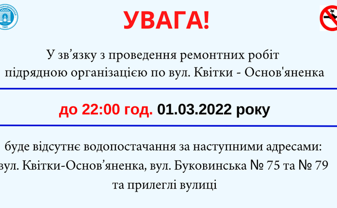 У Чернівцях, в зв’язку з проведенням ремонтних робіт підрядною організацією по вул. Квітки-Основ’яненка, 1 березня 2022 року до 22.00 год. буде відсутнє водопостачання до будинків по вул. Квітки-Основяненка, Буковинській, 75, 79 та прилеглих. Про це повідомляє КП “Чернівціводоканал”.
