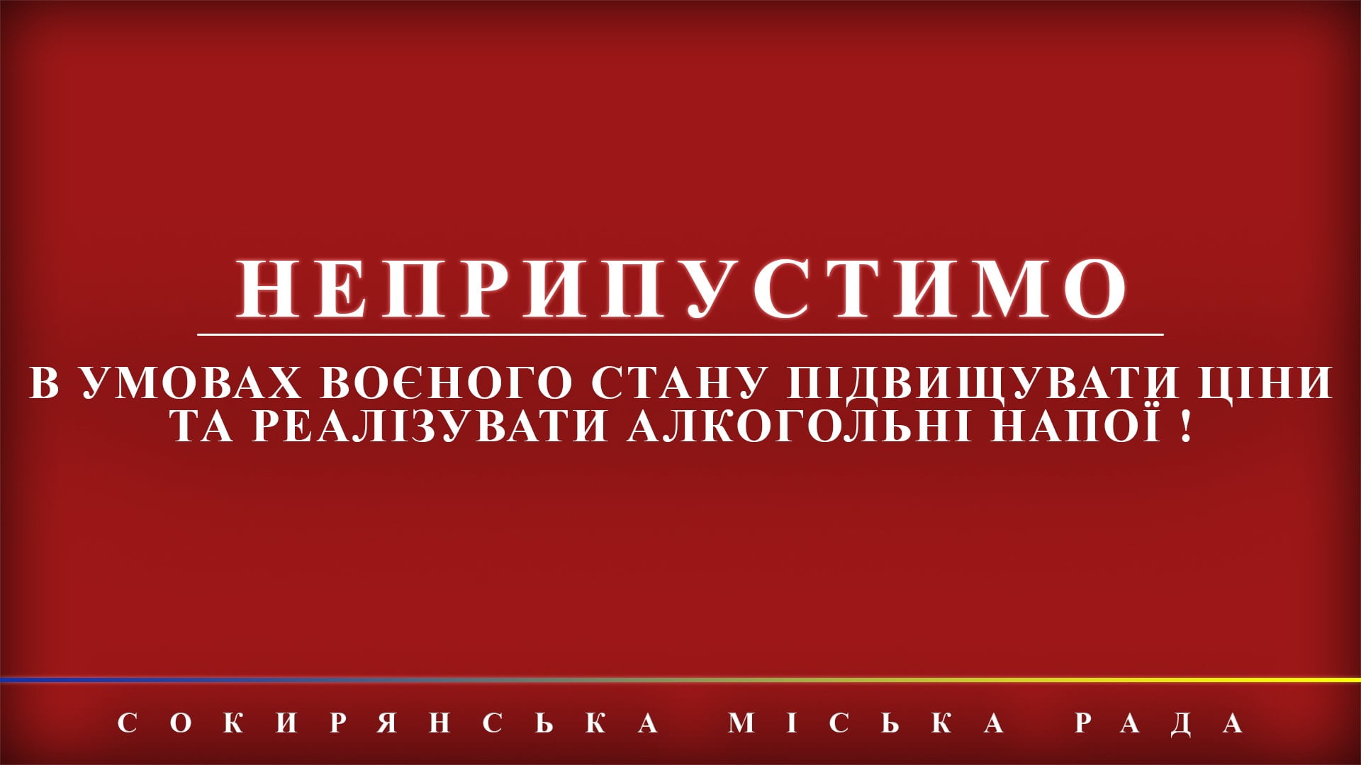 Окрім того, нагадуємо, що рішенням виконавчого комітету міської ради міської ради, на території Сокирянської громади ЗАБОРОНЕНО продаж алкогольних напоїв всім суб’єктам господарювання. Відповідне рішення також стосується осіб, які здійснюють реалізацію спиртних напоїв без оформлення відповідної діяльності та наявності ліцензії.