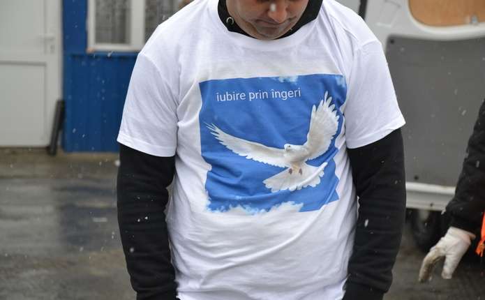 Доки ми спілкувалися, одну з автівок розвантажували іноземні волонтери. На їхніх білосніжних футболках зображено лет білого голуба у блакитному небі з написом: «Любов через Ангелів».