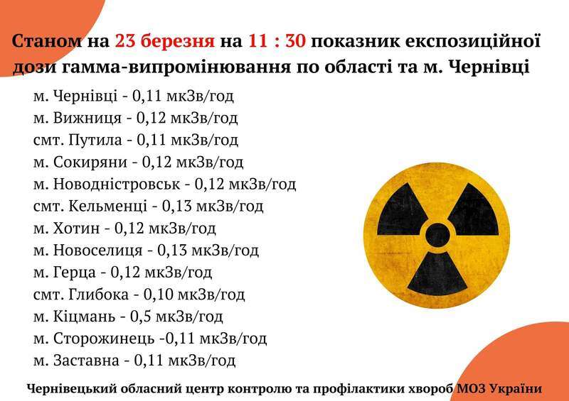 Станом на 23 березня на 11:30 показник дози гамма-випромінювання у Чернівцях та у Чернівецькій області знаходиться у межах норми та не перевищує 0,13 мкЗ/год.