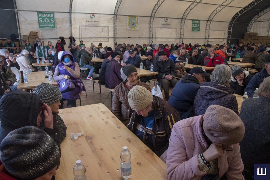 Здебільшого сюди приходять, щоб пообідати. Тож черги утворюються аж до зупинки громадського транспорту. Поки всередині намету одні їдять, інші ззовні чекають, поки звільниться місце. Такий конвеєр працює щодня. Люди сідають за стіл, а волонтери самі приносять їжу та воду.
