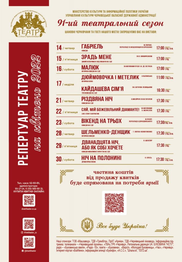 З 14 квітня Чернівецький обласний музично-драматичний театр імені Ольги Кобилянської відновлює роботу. У репертуарі на квітень заплановано комедії, музична казка, трагікомедія, Love-store з антрактом тощо.