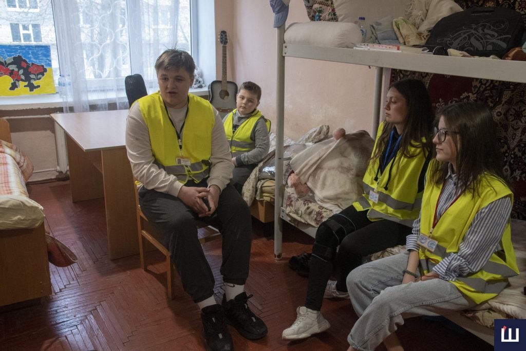 На ніч у гуртожитках залишається до 5 волонтерів. У разі повітряної тривоги люди спускаються в облаштований підвал із ліжками, закритими вікнами та двома опорними стінами. Туди часто йдуть із гітарами, а також там співають українських пісень чи гімн.