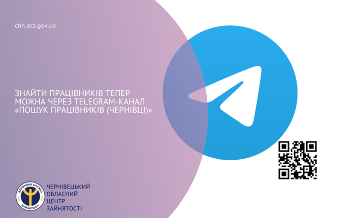 У Чернівцях запрацював Telegram-канал «Пошук працівників (Чернівці)» для роботодавців. Працедавці через пошук можуть оперативно підібрати необхідних фахівців, попередньо ознайомившись з короткими резюме. Приєднатися до каналу можна за посиланням.